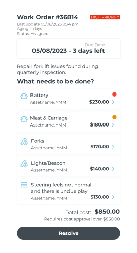 Automatically turn failed checks into work orders, assign tasks to the right team, and track parts, labor, and costs. Real time updates keep everyone aligned—from field teams on sites to managers in the office.