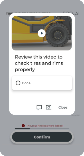 Guide workers step by step with visual, equipment-specific workflows and one-tap controls to speed inspections and safety checks while ensuring accuracy and accountability for every skill level.
