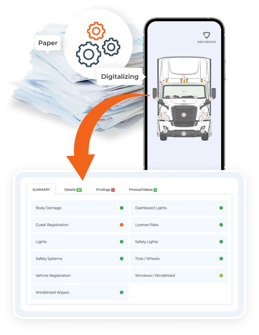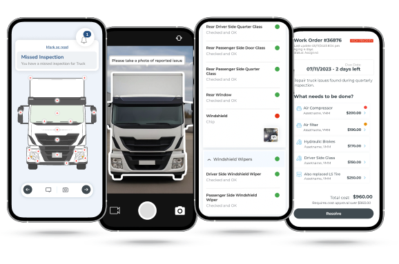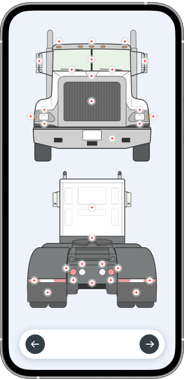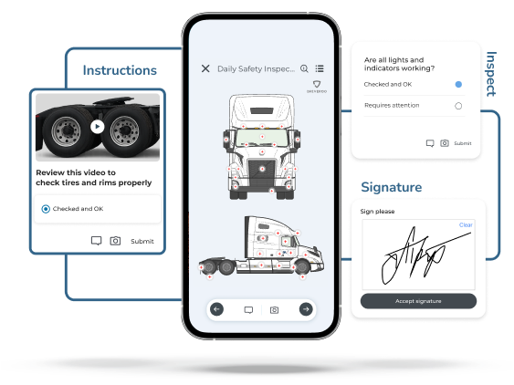 - Guided, visual DVIR – exact visuals with inspection points guide drivers through complete inspections, including extra equipment and safety gear.